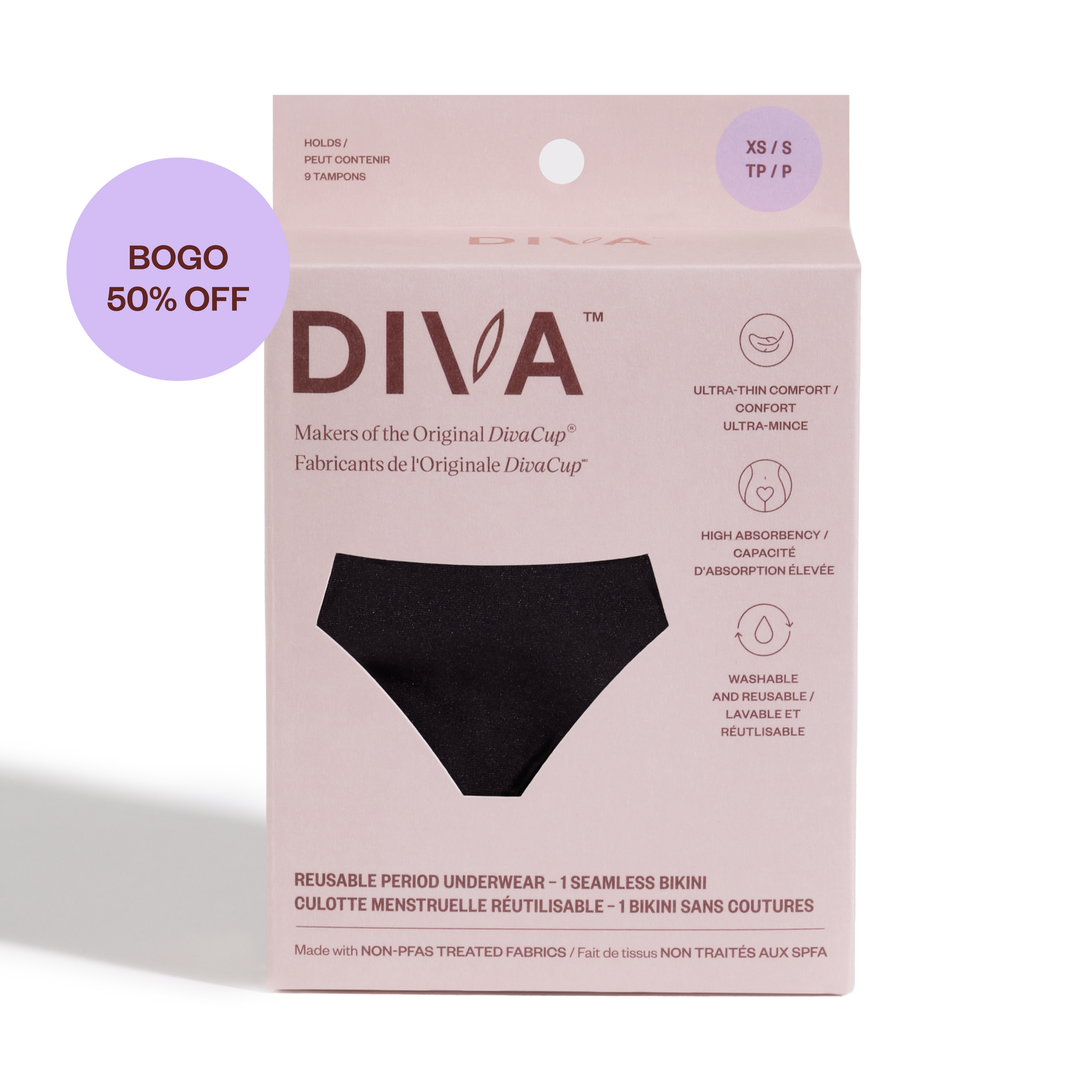 DIVA Period Underwear absorbs up to 9 regular size tampons worth of menstrual flow.
